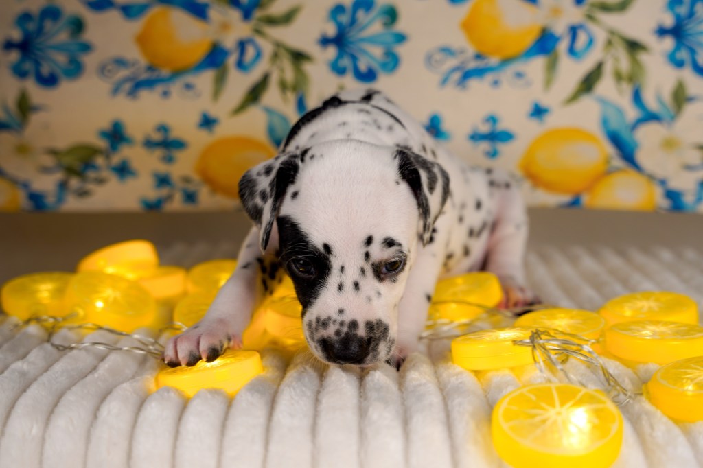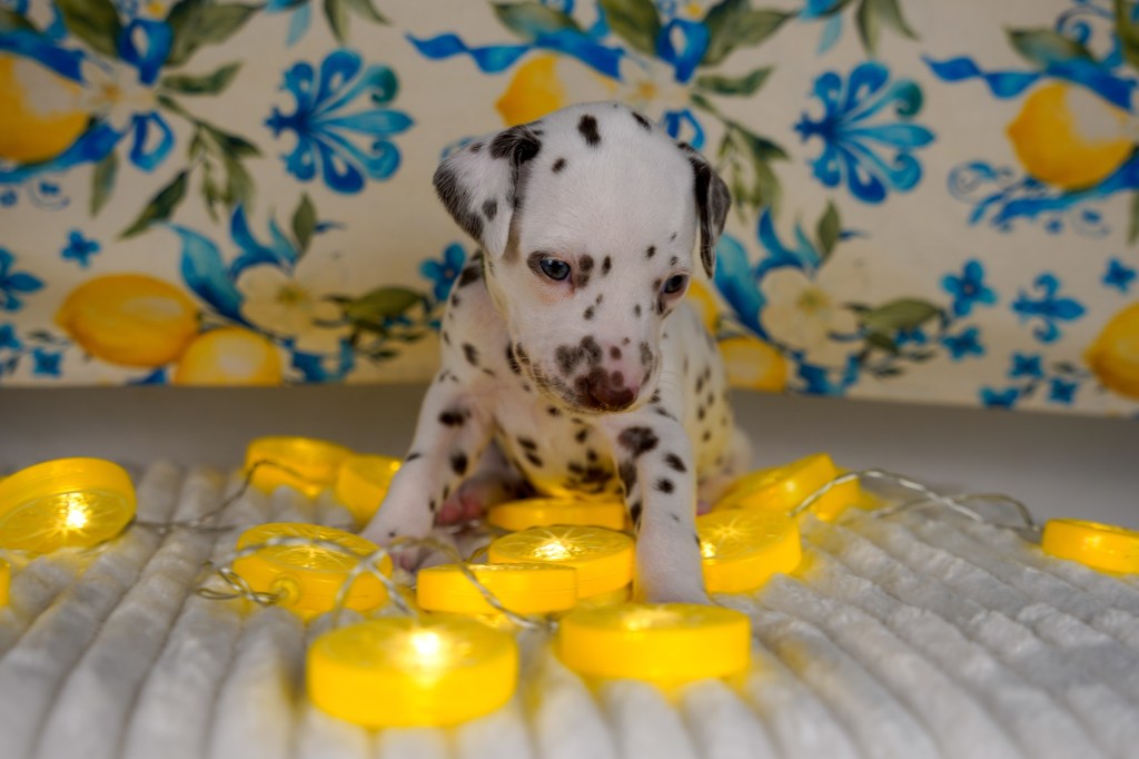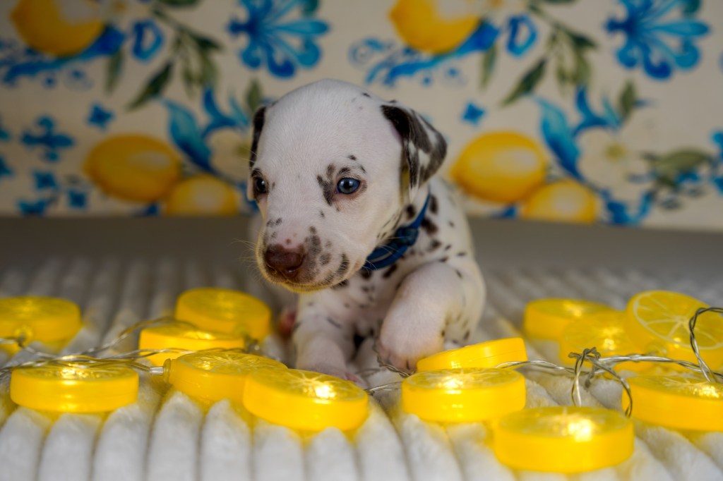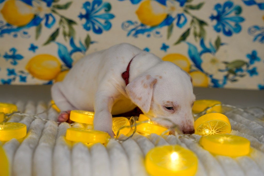 Erste vorsichtige Spielversuche werden unternommen und man erkundet verschiedene Untergründe und knisternde Spielzeuge. Die Spielzeuge wechseln immer mal wieder, wenn sie in die Wäsche müssen und so gibt’s immer mal was anderes im Welpenparadies.