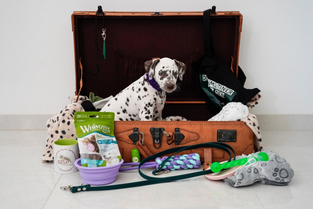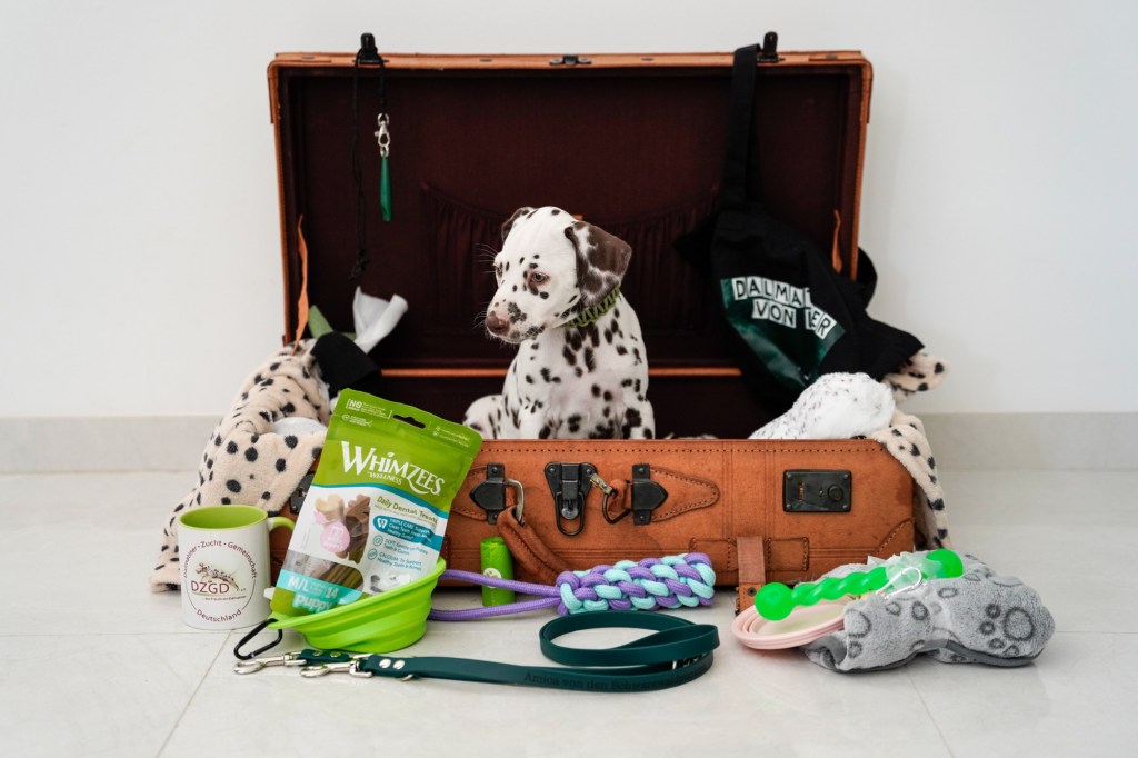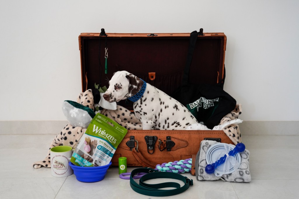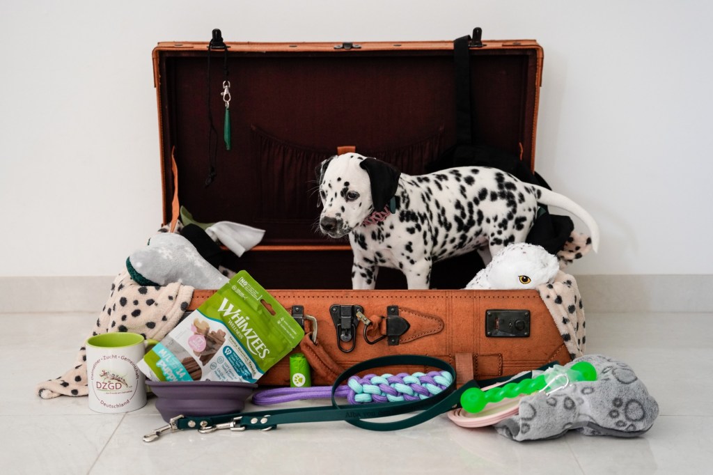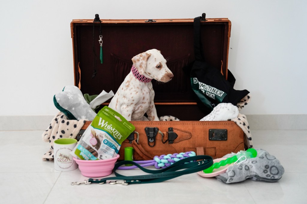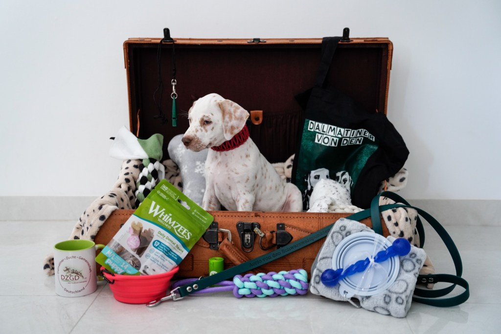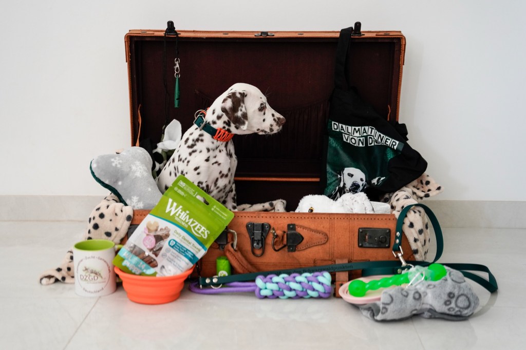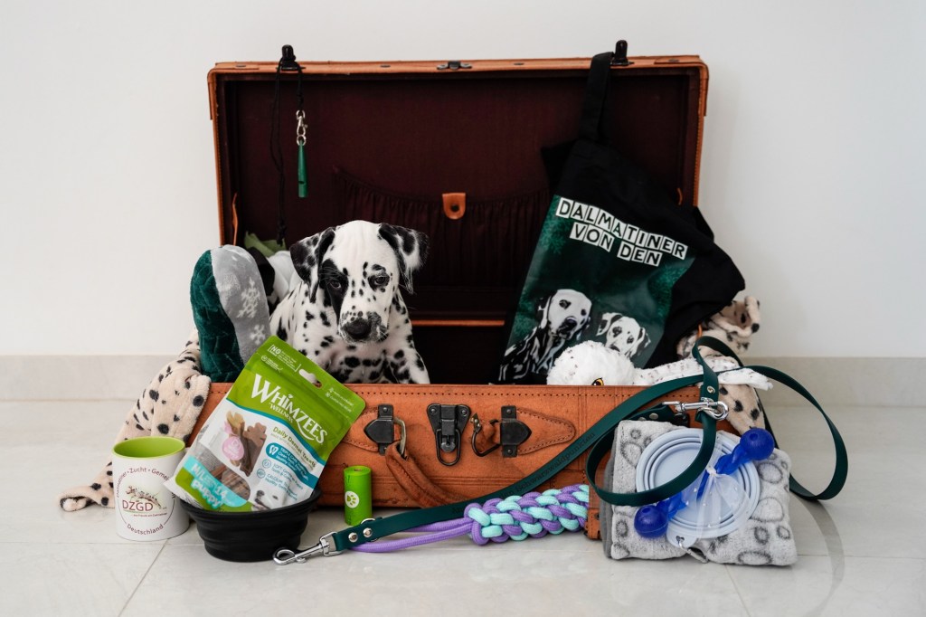 Die Hündinnen mit ihren gepackten Köfferchen: