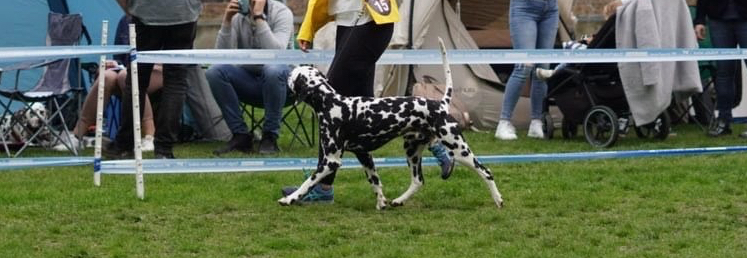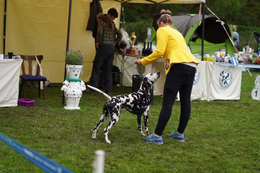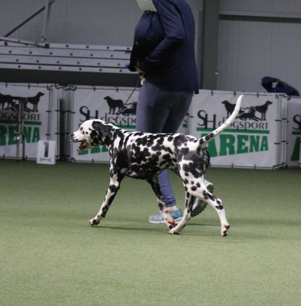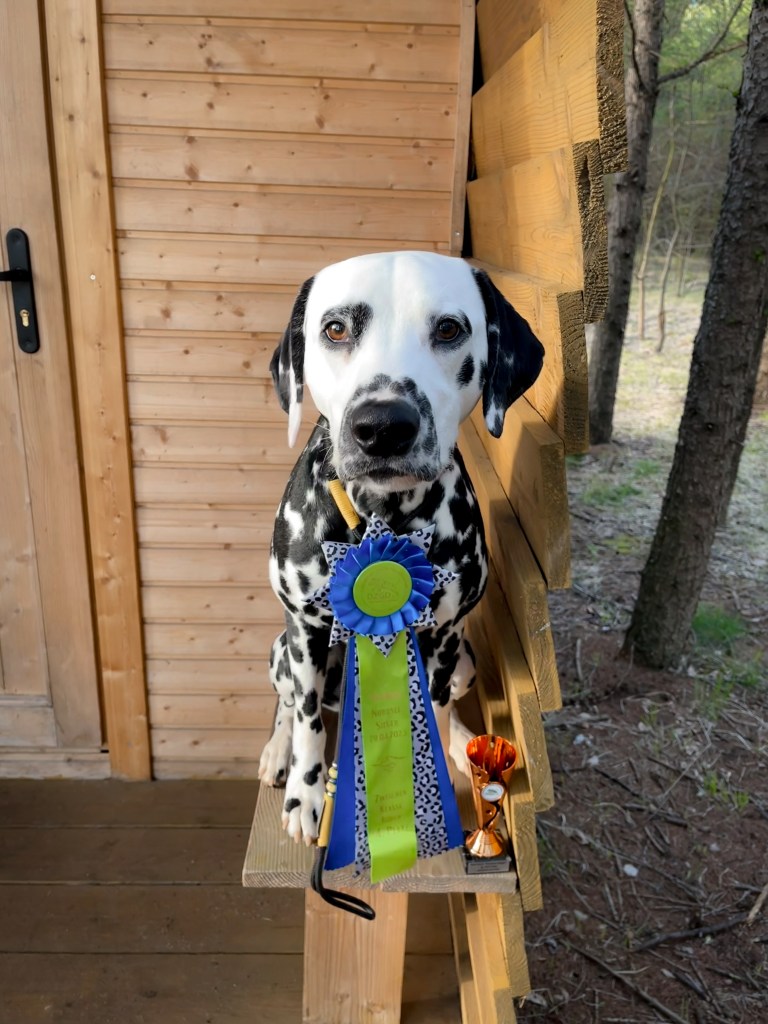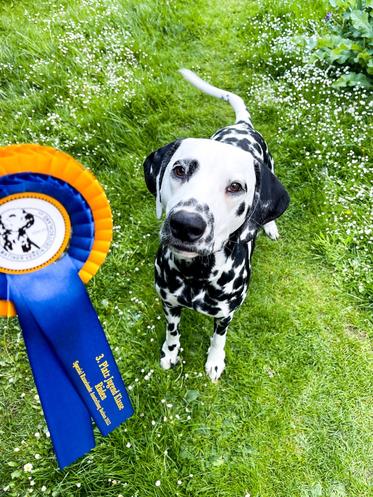 Bei unserer aller erste Ausstellung in der Jugendklasse mit 10 Monaten hatten wir keine Erwartungen. Wahrscheinlich war ich nervöser als Morton selbst. Um so stolzer war ich, dass Morton sich toll präsentiert hat. Leider reichte es aufgrund seiner teilweise ineinander laufenden vielen Flecken nur für die Wertung Gut.