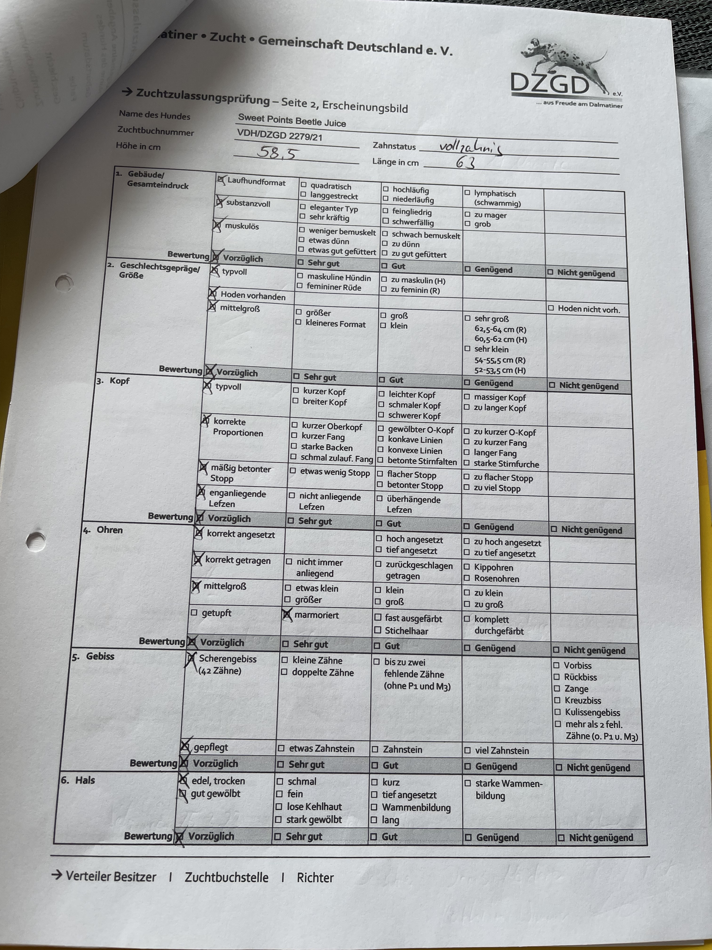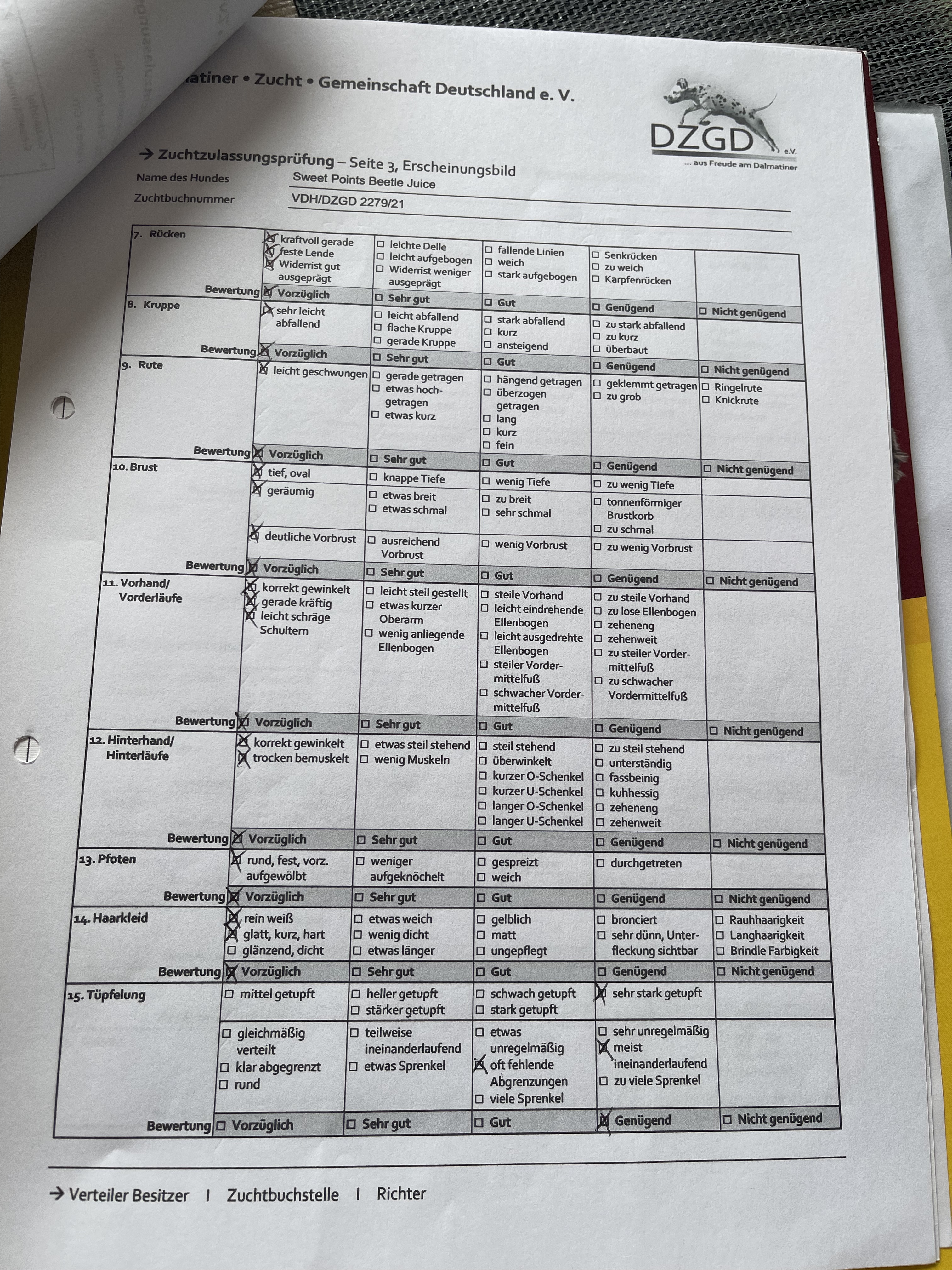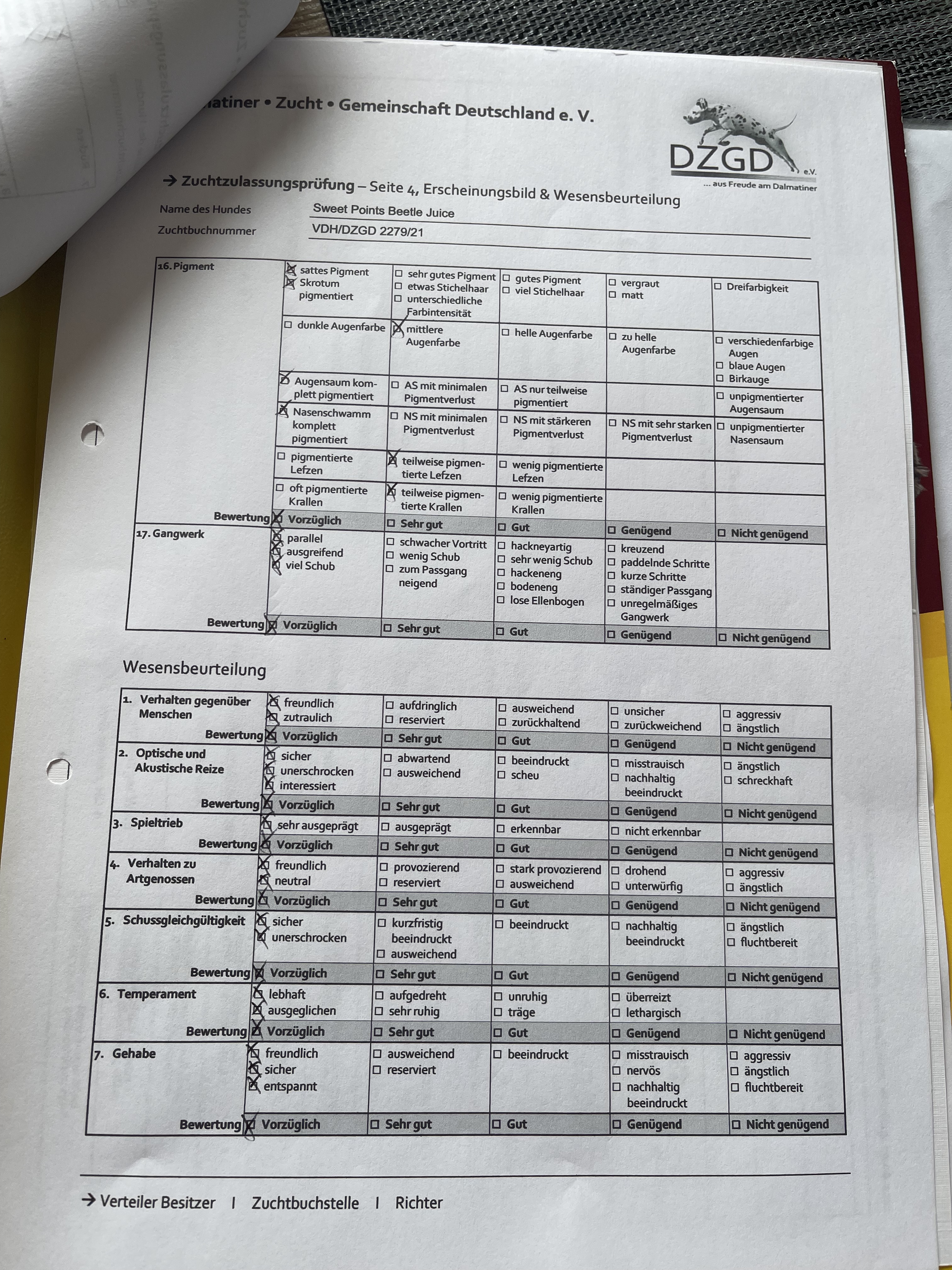 Zuchtzulassung am 25.03.2023: Erscheinungsbild 16 -Vorzüglich und 1 Genügend (Tüpfelung) & Wesensbeurteilung: 7 -Vorzüglich; Hinweis: auf gleichmäßige saubere Fleckung achten