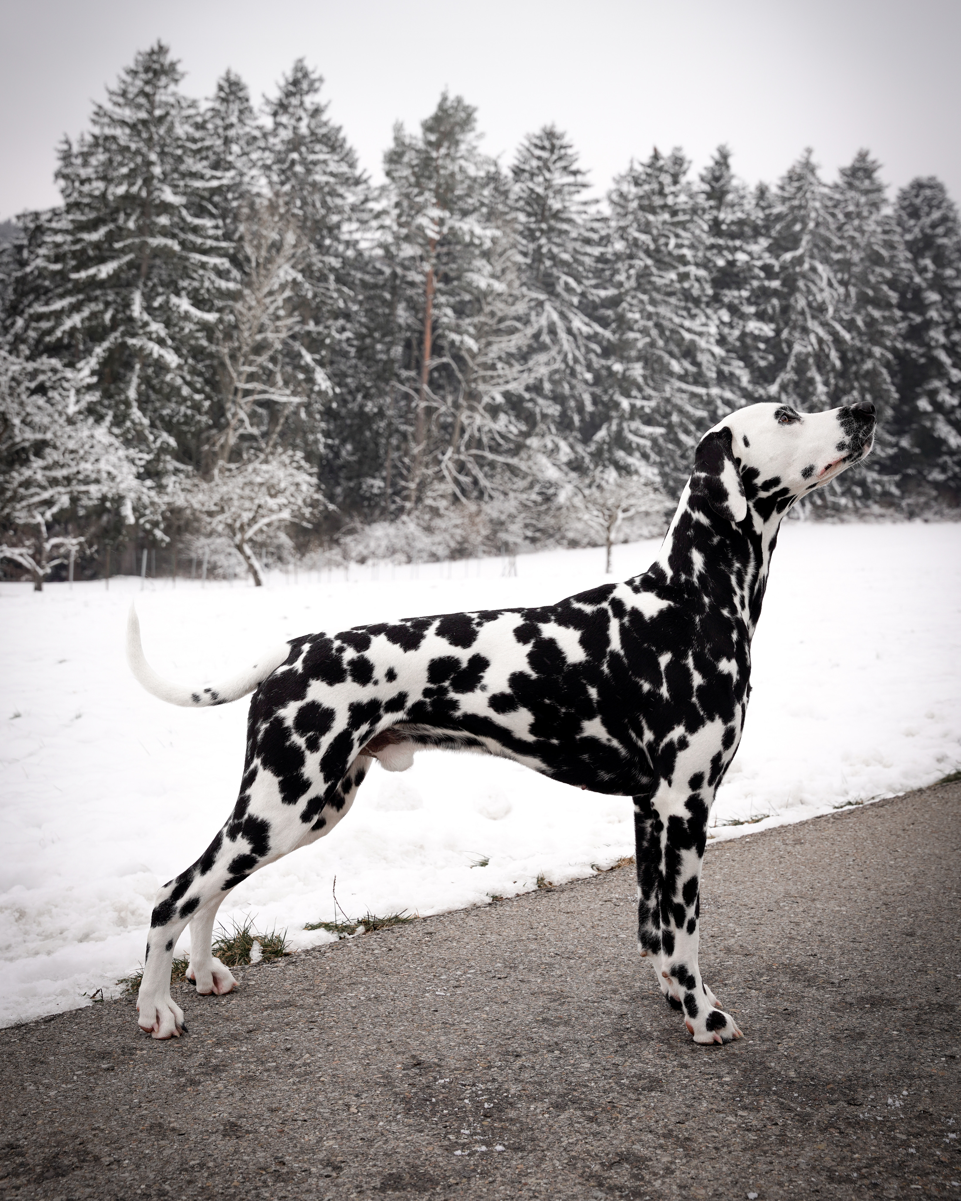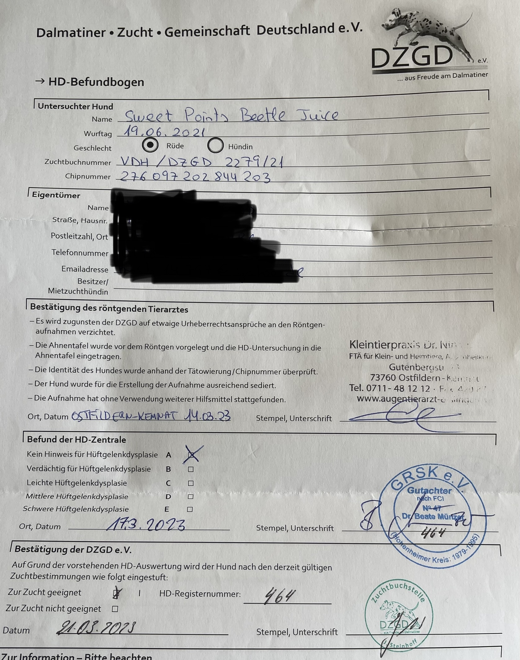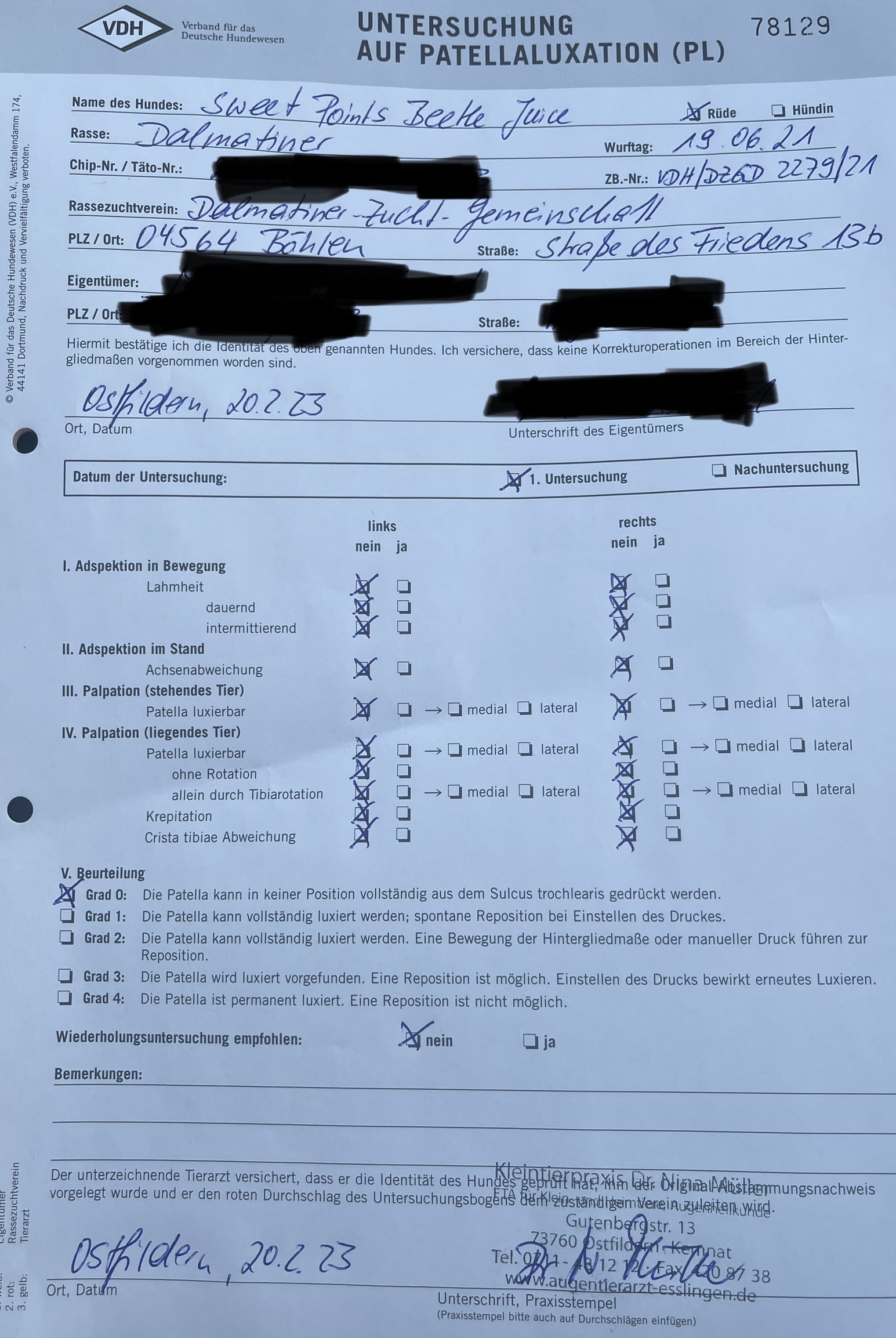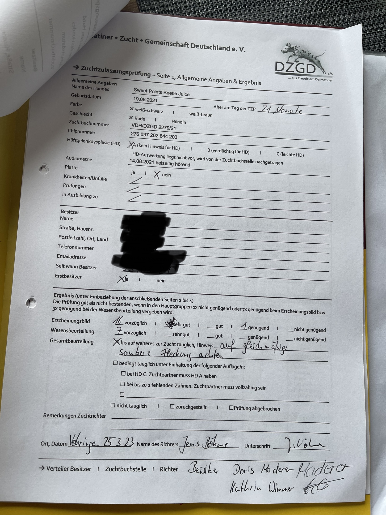 Zuchtzulassung am 25.03.2023: Erscheinungsbild 16 -Vorzüglich und 1 Genügend (Tüpfelung) & Wesensbeurteilung: 7 -Vorzüglich; Hinweis: auf gleichmäßige saubere Fleckung achten