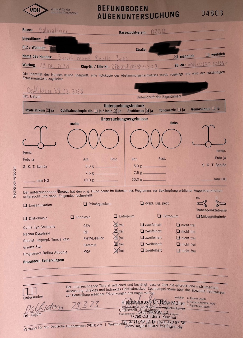 Ergebnisse von durchgeführten Untersuchungen: HD A, ED 0, Pl. 0, Spondylose frei, Lüw frei, PKD Untersuchung: kein Hinweis auf Nierenzysten, erbliche Augenkrankheiten: kein Hinweis –> CEA, RD, PHTVL/PHPV, Katarakt, PRA : frei